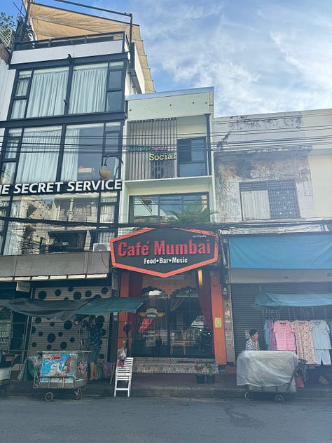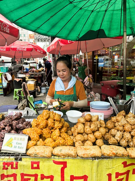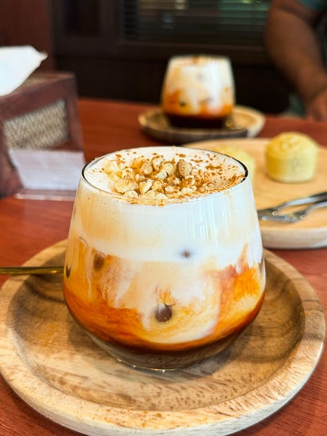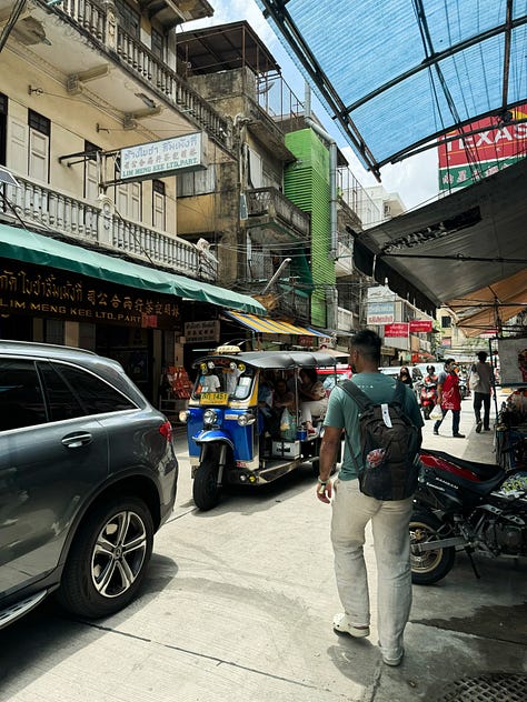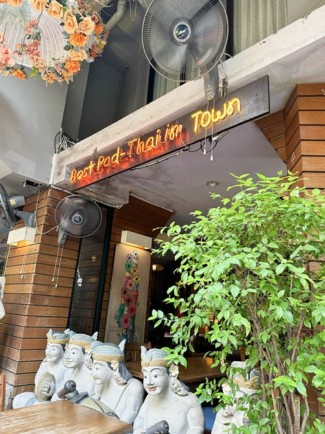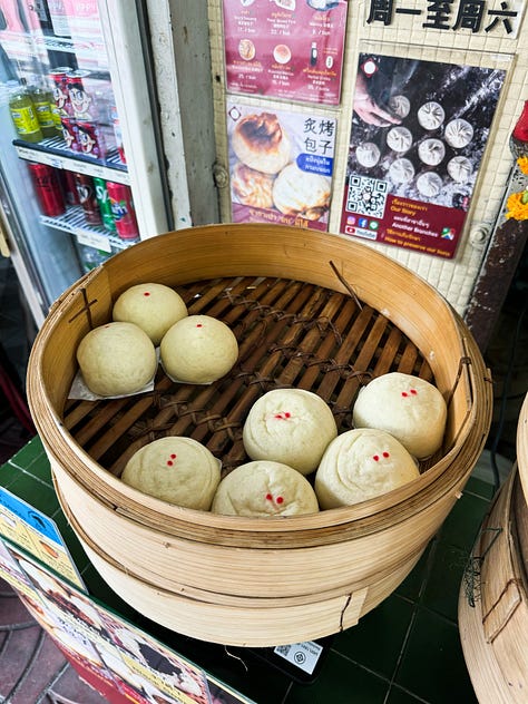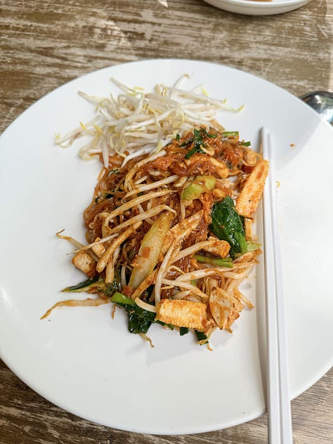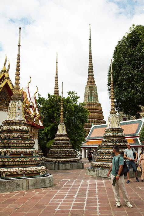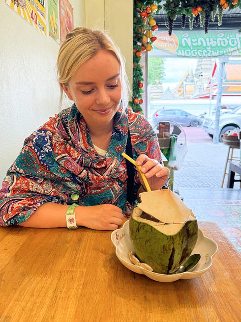 Whilst in Bangkok we went to see the reclining Buddha which is absolutely ginormous! We’d seen it on the most recent series of Race Across the World and to be there in real life felt really special. The surrounding temples are beautiful too, I’ve never seen anything like it. We even got to witness monks leading a religious prayer service. We then took a slow, hot walk into China Town. I had my first fresh coconut…I don’t typically like coconut water but the fresh coconuts here are divine, I’ve had one pretty much every day. In China Town we stumbled across a gorgeous tea house and had the most stunning Thai tea I have ever had in my life. I’ve been dreaming of it since. I also tried a plant-based pork bao bun from a vendor that’s been running for over 100 years and some deep fried yellow tofu - delish! We got a tuk tuk back to our hostel, relaxed for a couple of hours and then tackled Khao San Road for dinner. It was surprisingly calm and enjoyable considering what we’d read online, but we did visit early evening. We tried one of our favourite dishes of the trip so far…mango sticky rice! If I can recreate that one day I’ll be one happy girl. I also ordered some veggies to get some solid plant points in!🪴 We saw some…questionable things….including tarantulas, scorpions, alligator...things I quickly looked away from!